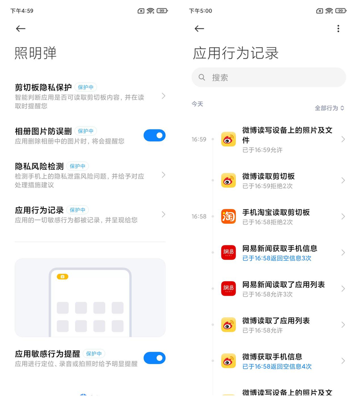 隱私保護是MIUI 12.5的一大優勢,升級之后的小米11 Ultra可以更好的對應用進行管理。MIUI12.5 里加入了對剪切板內容的保護,曝光應用的讀取行為,并且對合理的讀取行為智能放行。