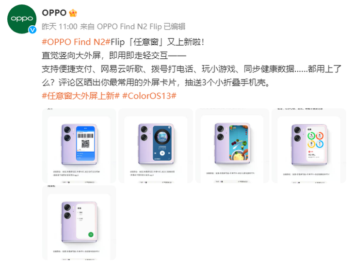 OPPO Find N2 Flip任意窗獲得更新,新增多種功能卡片加入