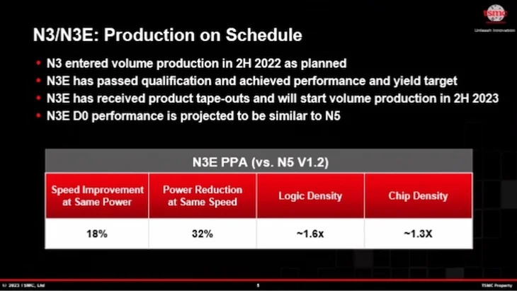 根據了解,臺積電旗下的N3E工藝相比較現階段的臺積電5nm工藝,可在相同頻率下降低 32% 的功耗,或者在相同功耗下提高 18% 的性能。而N3P則可在相同頻率下相比較于N3E降低5-10%的功耗,在同功耗的情況下提升5%的性能。