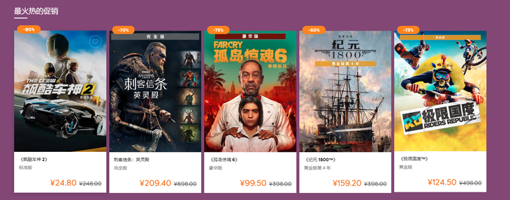 根據育碧官方目前釋放的消息顯示,現階段育碧旗下的《孤島驚魂6》豪華版的價格為99.5元、《看門狗:軍團》標準版價格為44.7元、《刺客信條:英靈殿》完全版的價格為205.4元,除此之外,育碧旗下的一系列與游戲均有相關的折扣優惠。