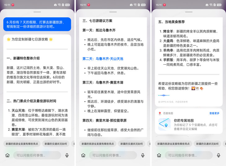 除了在影像方面大有可為之外,OPPO Reno12內建的強大AI功能還有很多用途,例如基于AI設計的小布旅行助理,能夠為說走就走的旅行提供即時出行建議。例如制定行程規劃時,用戶可將感興趣的旅行指南帖子標記給小布助手,即可基于多篇攻略帖快速生成旅行指南,并且能夠為你提供詳細美食打卡、景點路線和酒店住宿等目的地攻略,助你說走就走也能玩得盡興。