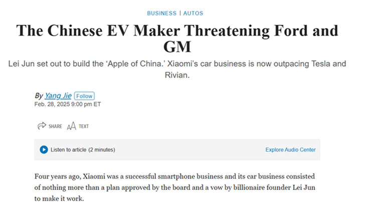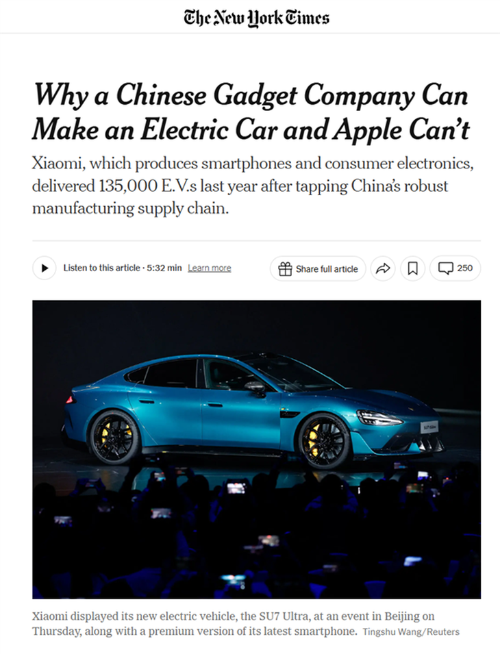 在全球汽車行業的視角中,紐約時報也表示,為什么像小米這樣的電子產品公司能夠成功制造電動汽車,而蘋果卻尚未實現。憑借中國強大的制造業供應鏈,小米在進入汽車行業后交付了135,000輛電動汽車,甚至在一定程度上超過了特斯拉和Rivian,展現了中國電動汽車制造商對全球市場的巨大威脅。