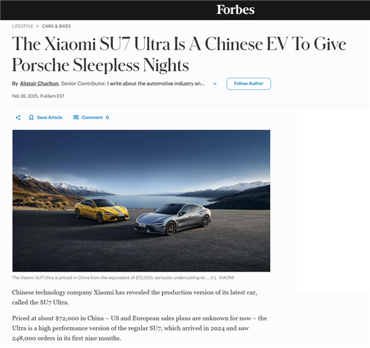 除了在國內市場大受歡迎,小米SU7 Ultra也吸引了國際媒體的關注。美國多家媒體給予了它高度評價,認為它在全球電動車領域樹立了新標桿。福布斯稱其為一款讓保時捷徹夜難眠的中國電動汽車,強調其搭載的三電機系統可提供超過1500匹馬力,且零百加速僅需1.98秒。