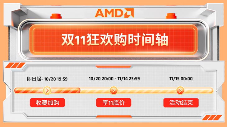 此次AMD天貓官方旗艦店的雙十一狂歡購從10月20日晚上19:59就開始了,一直到2025年11月14日23:59都是活動時間,期間大家都可以享受到雙十一底價來購買到心儀的商品,整個促銷期持續近一個月,而且所涵蓋硬件商品的豐富程度也可以說是再創新高。