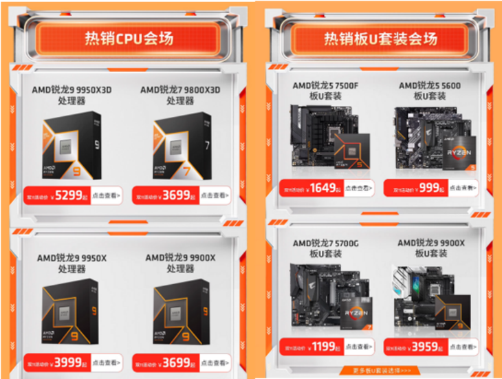 除了爆款熱銷的CPU單品之外,活動頁面有很多AMD銳龍處理器的板U套裝和卡U套裝,這些結合了AMD和合作伙伴芯片組產品和顯卡產品的套裝不僅搭配起來相得益彰,套裝價格更是優惠,方便大家一站購全想要的硬件。
