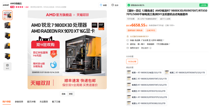 最后這款整機是目前配置可選性最多的一款,它來自AMD電腦旗艦店,使用了多款AMD最具人氣的處理器打造,無論是銳龍5 7500F、銳龍7 9700X還是銳龍7 9800X3D,一定有一款處理器是最合適朋友們的,而且主板和顯卡的搭配也特別靈活,內存和SSD的選配也很合理,大家完全可以在各個SKU中進行一次DIY攢機,一定可以選到最適合自己那一款。目前這款整機可使用88VIP的9折無門檻消費券,曬單再返20元天貓超市卡,保價雙十一。