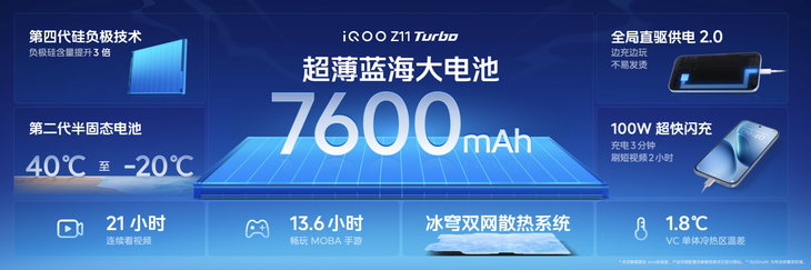 iQOO Z11 Turbo內置7600mAh超薄藍海大電池,采用行業領先的第四代硅負極技術,能量密度達iQOO全系最高的860Wh/L,續航能力遠超同尺寸性能機。配合100W超快閃充與全局直驅供電2.0技術,邊玩邊充不發燙、不傷電池,一杯咖啡的時間即可回血過半。